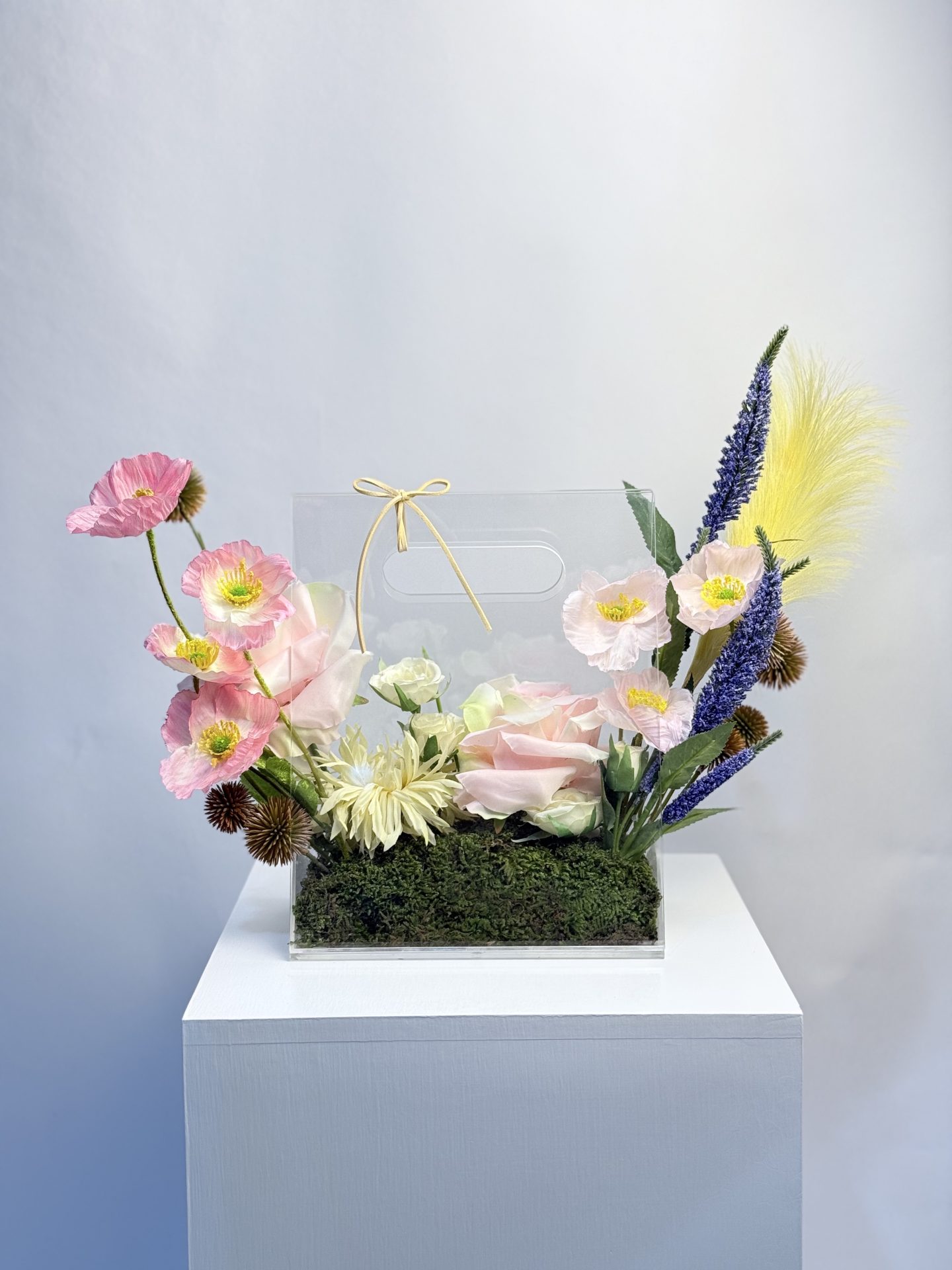 การจัดดอกไม้ในกล่องใสสไตล์ทันสมัย ประกอบด้วยกุหลาบชมพูอ่อน ดอกป๊อปปี้ และดอกไม้หลากชนิด เติมเต็มด้วยโทนเหลืองสดและม่วงลึก ตกแต่งบนฐานมอสสีเขียวธรรมชาติ สวยหรูและแปลกตา เหมาะสำหรับเป็นของขวัญวันเกิด การแสดงความยินดี หรือเพื่อเติมความสดใสให้มุมโปรดในบ้านหรือออฟฟิศ