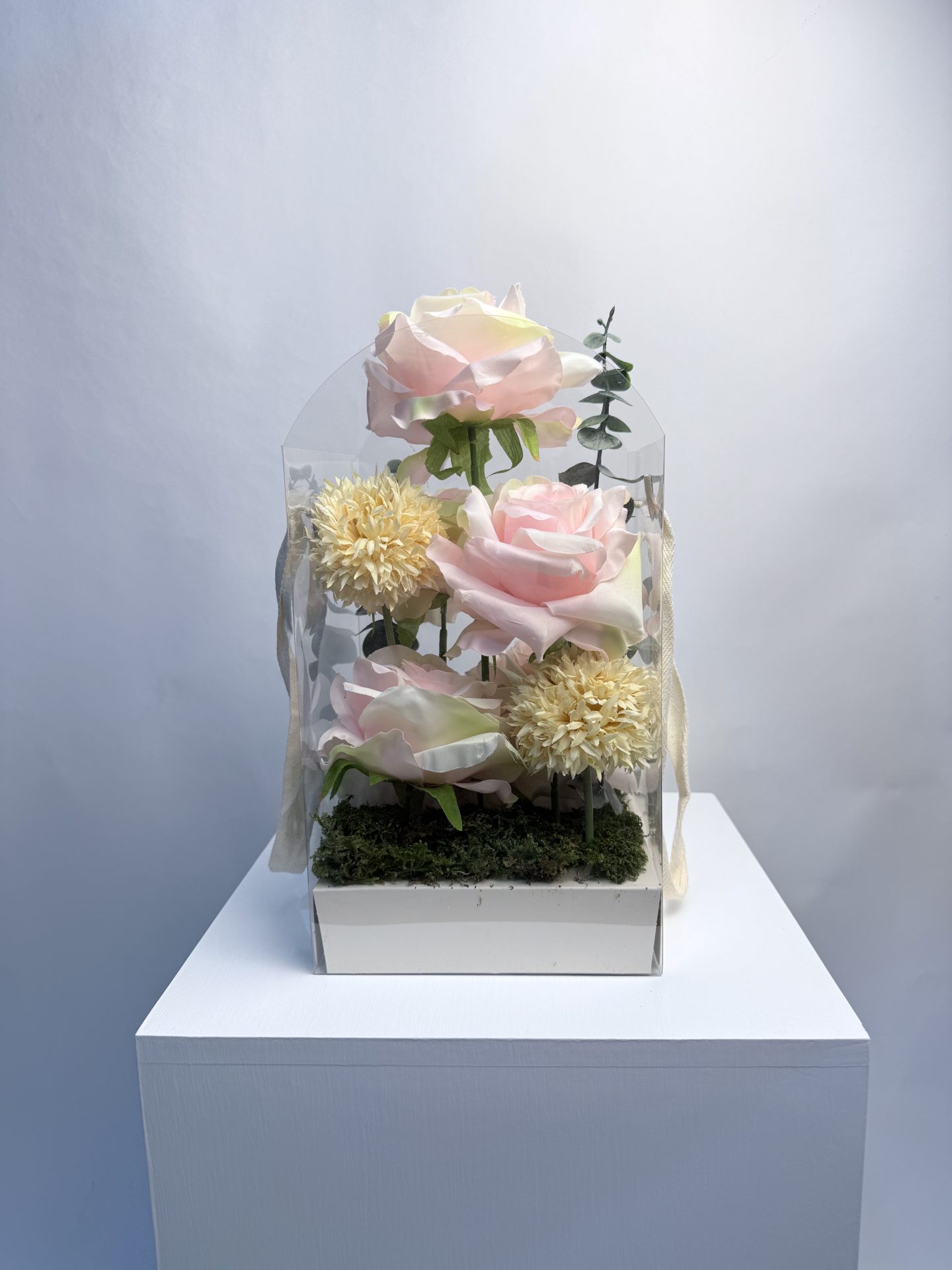 การจัดดอกไม้ในกล่องใสทรงสูง ดีไซน์มินิมอล โดดเด่นด้วยกุหลาบชมพูพาสเทลและดอกโทนครีม เติมความหรูหราด้วยโทนเขียวธรรมชาติ จัดเรียงอย่างมีมิติบนฐานมอสสีเขียวเข้ม ให้ความรู้สึกละมุนตาและมีรสนิยม เหมาะสำหรับการมอบในโอกาสพิเศษ เช่น วันครบรอบ วันเกิด หรือเพื่อแสดงความรักและความห่วงใยอันบริสุทธิ์