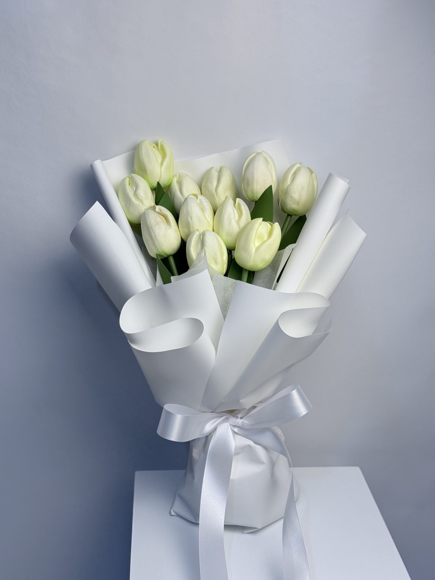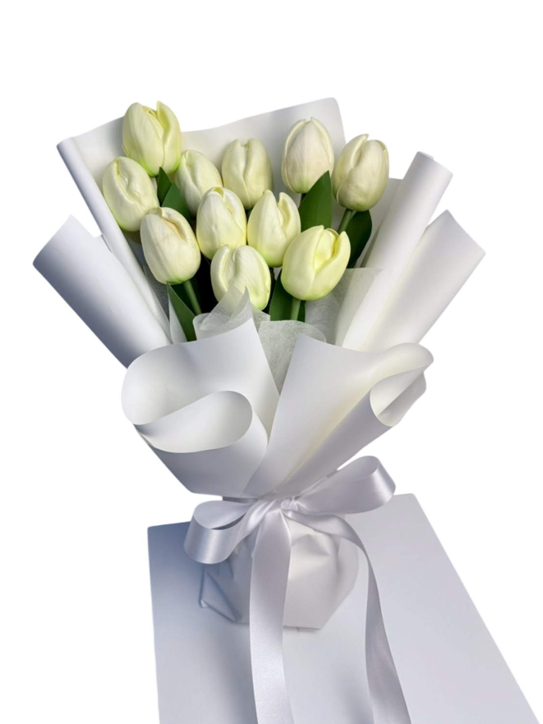 ช่อทิวลิปขาวโทนอบอุ่น ให้ความรู้สึกสงบสุขและสดใสในเวลาเดียวกัน เหมาะสำหรับมอบให้คนพิเศษในวันที่ต้องการกำลังใจ หรือแทนคำขอบคุณอย่างจริงใจ