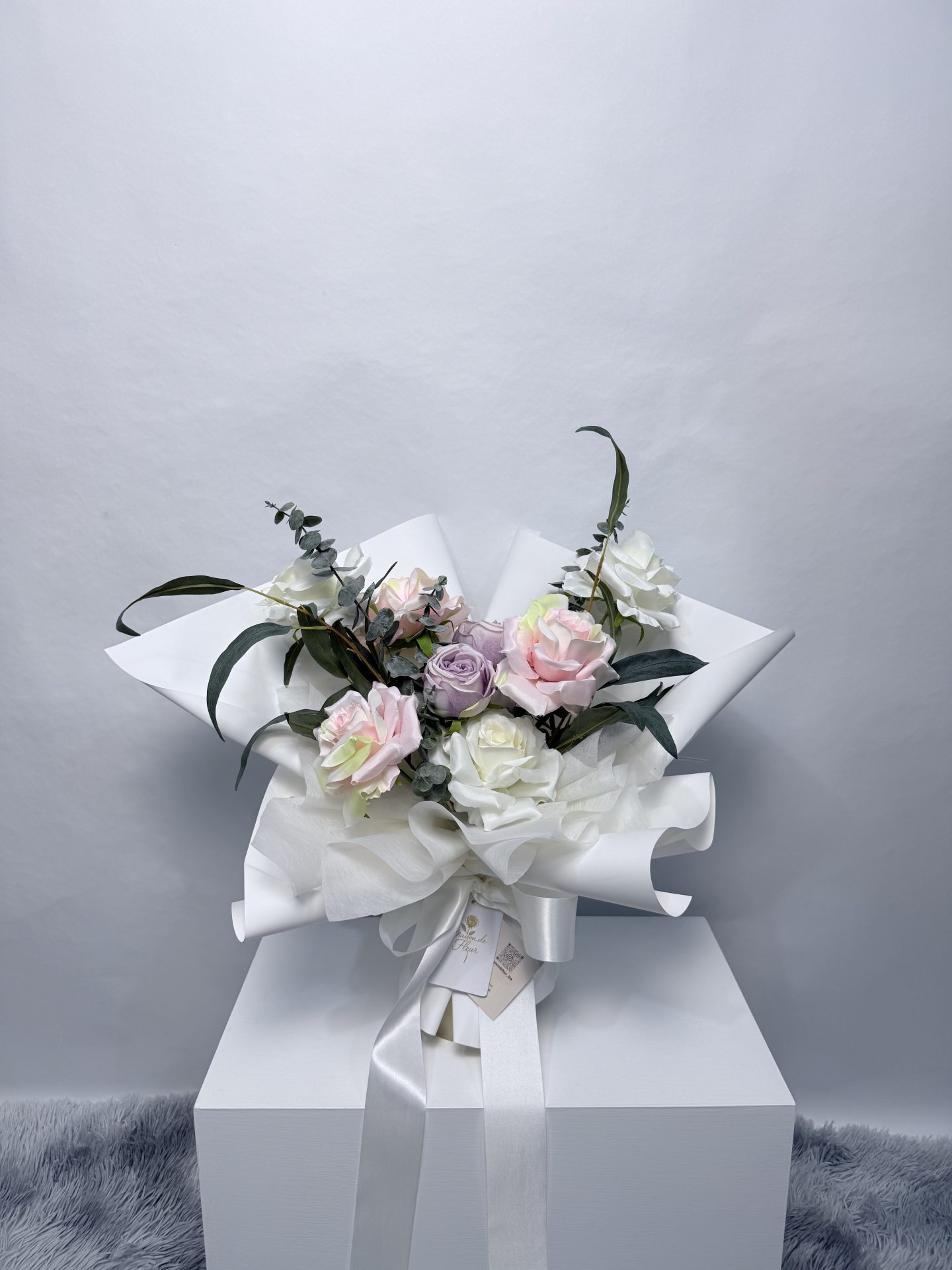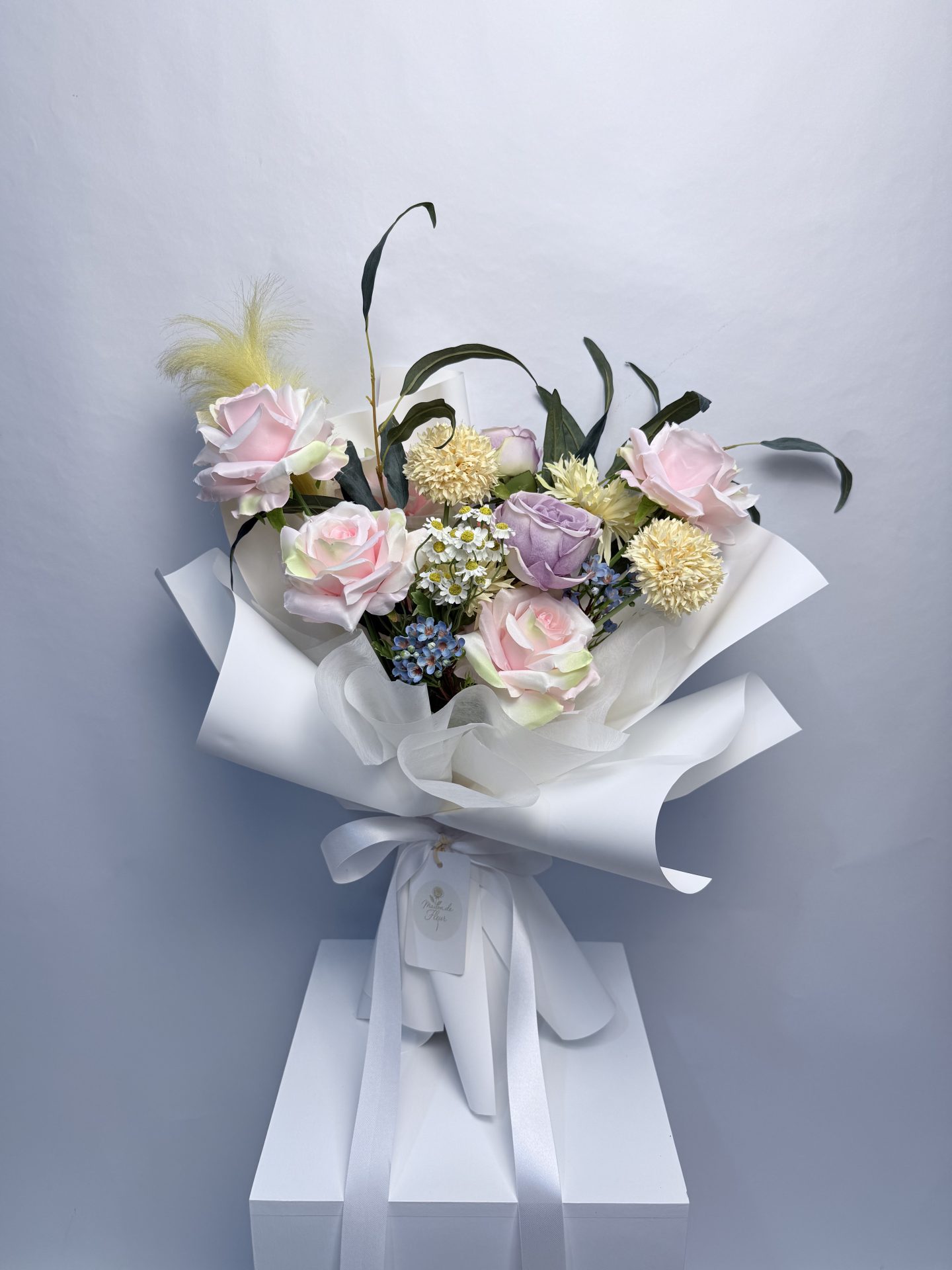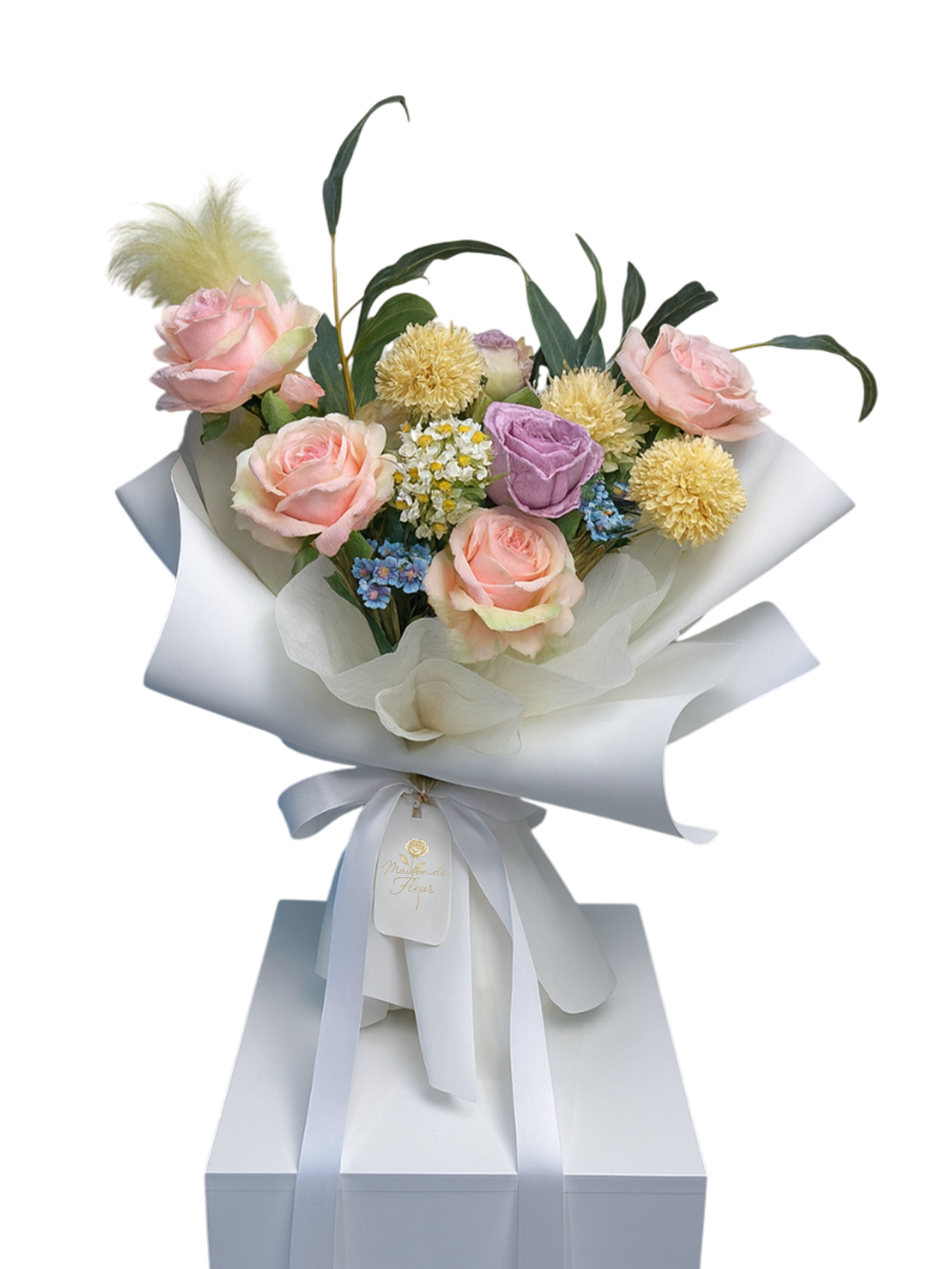 ดอกกุหลาบชมพูอ่อนผสานกับขาวนวลและดอกไม้หลากสีพาสเทล แทนความสง่างาม ความอ่อนหวาน และความรู้สึกที่เต็มไปด้วยความจริงใจ
