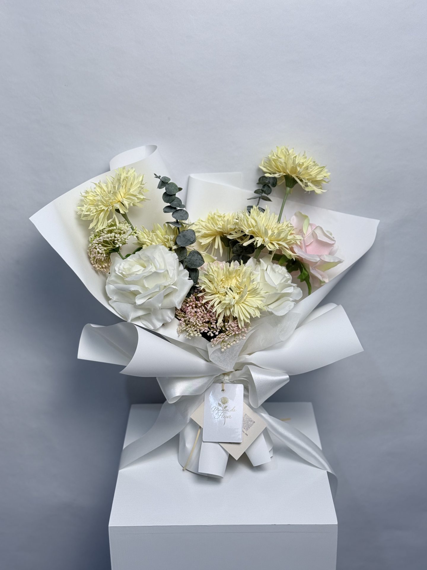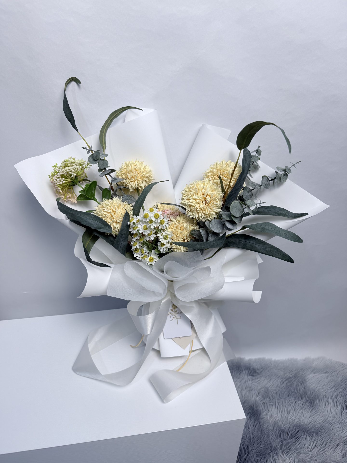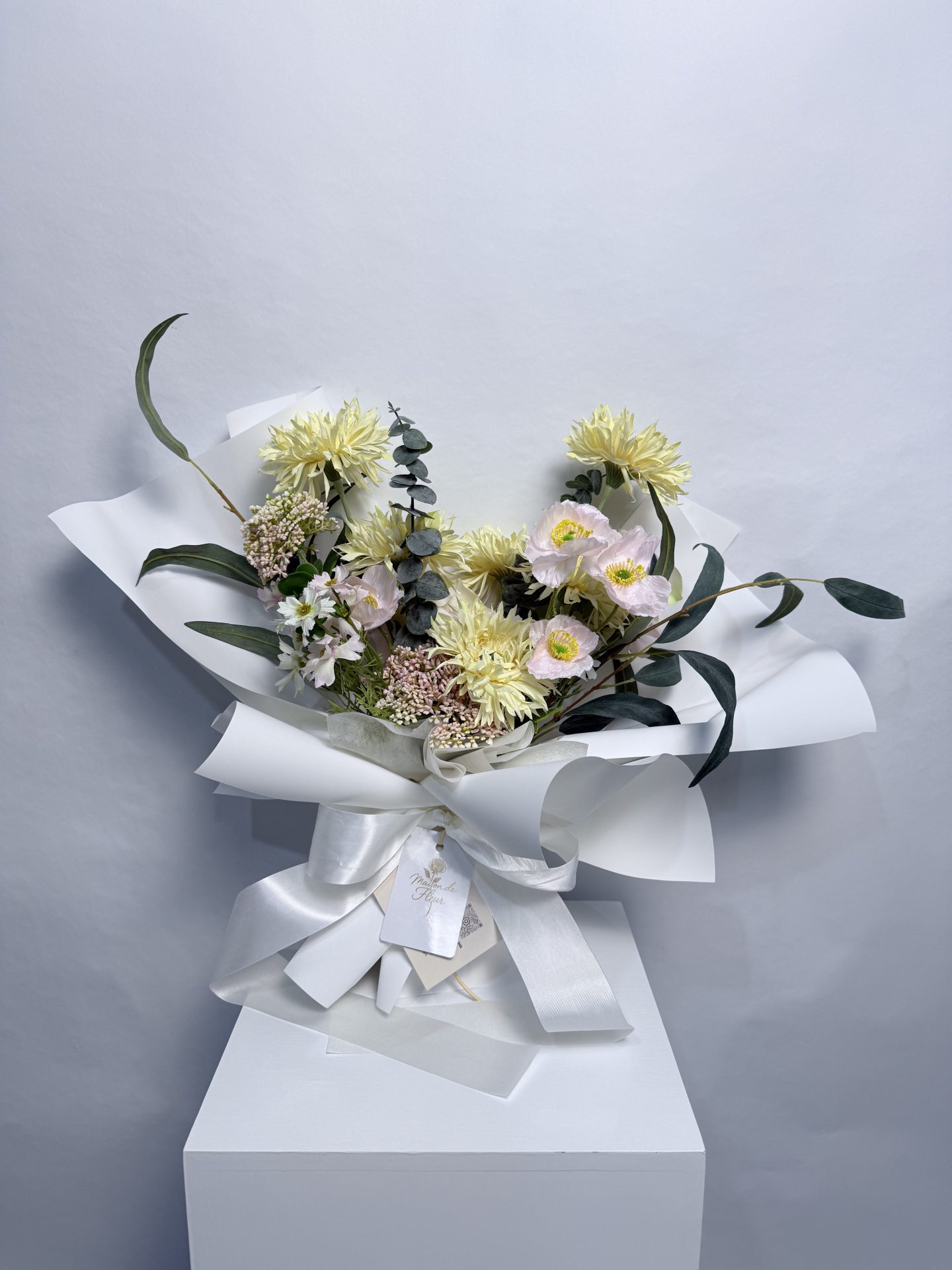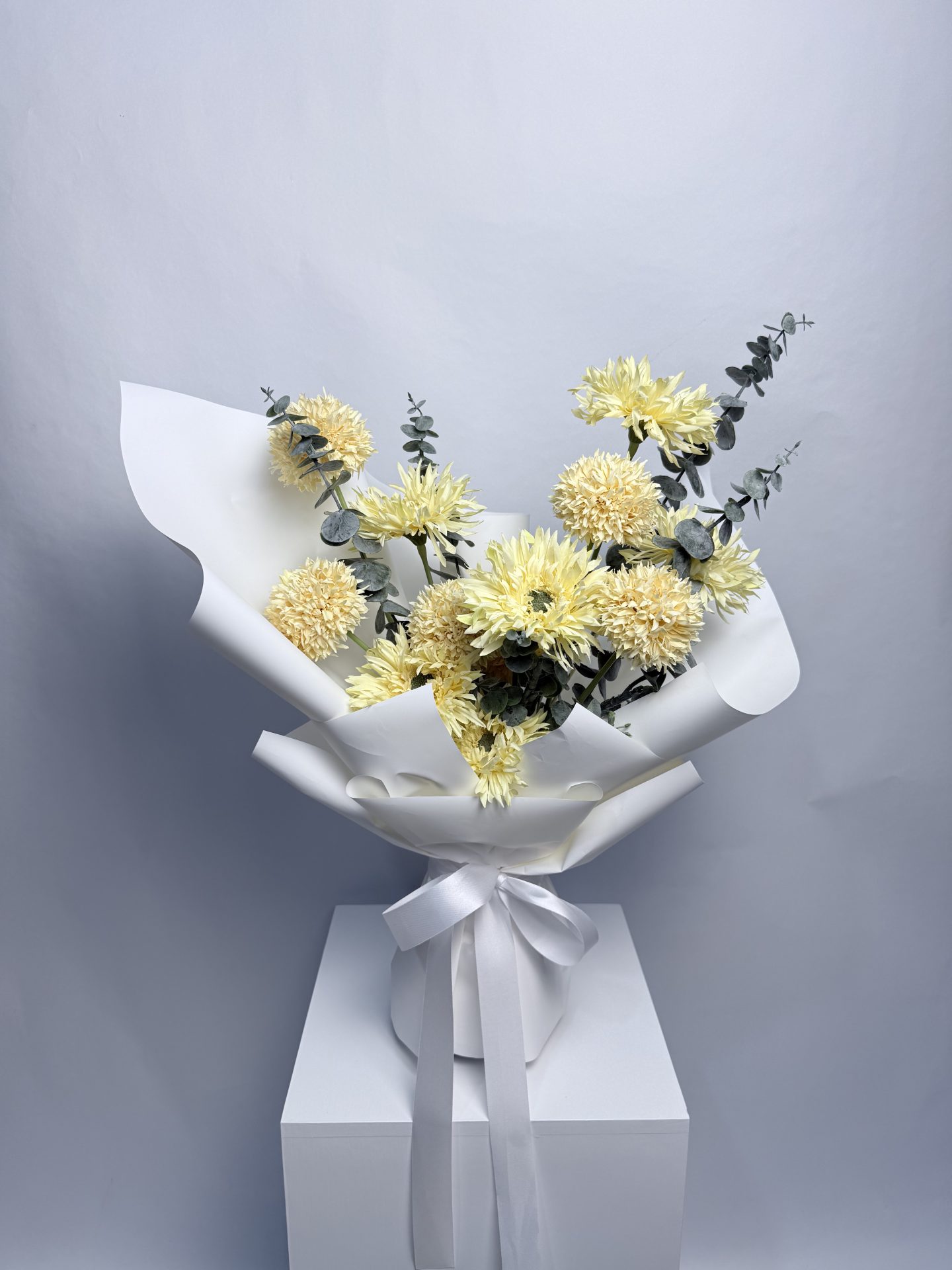 ช่อดอกไม้โทนเหลืองอ่อน จัดด้วยดอกไม้ทรงกลมฟูคู่กับใบยูคาลิปตัส เติมเต็มด้วยการห่อสีขาวมินิมอลและผูกโบว์สีขาวอย่างหรูหรา ให้บรรยากาศสงบ สว่าง และเรียบง่าย เหมาะสำหรับเป็นของขวัญในทุกโอกาส ทั้งวันเกิด การแสดงความยินดี หรือเพื่อมอบกำลังใจให้คนพิเศษ