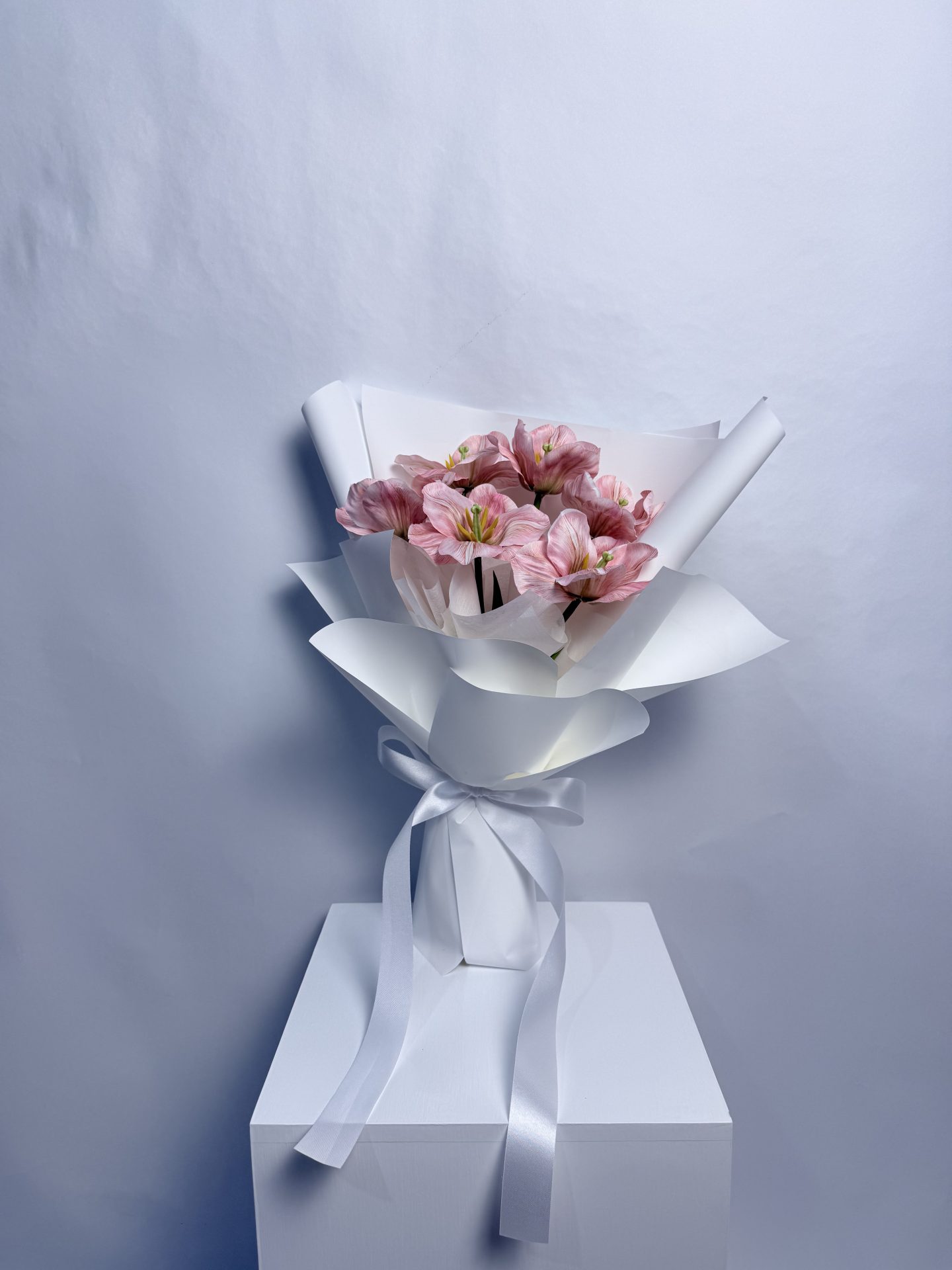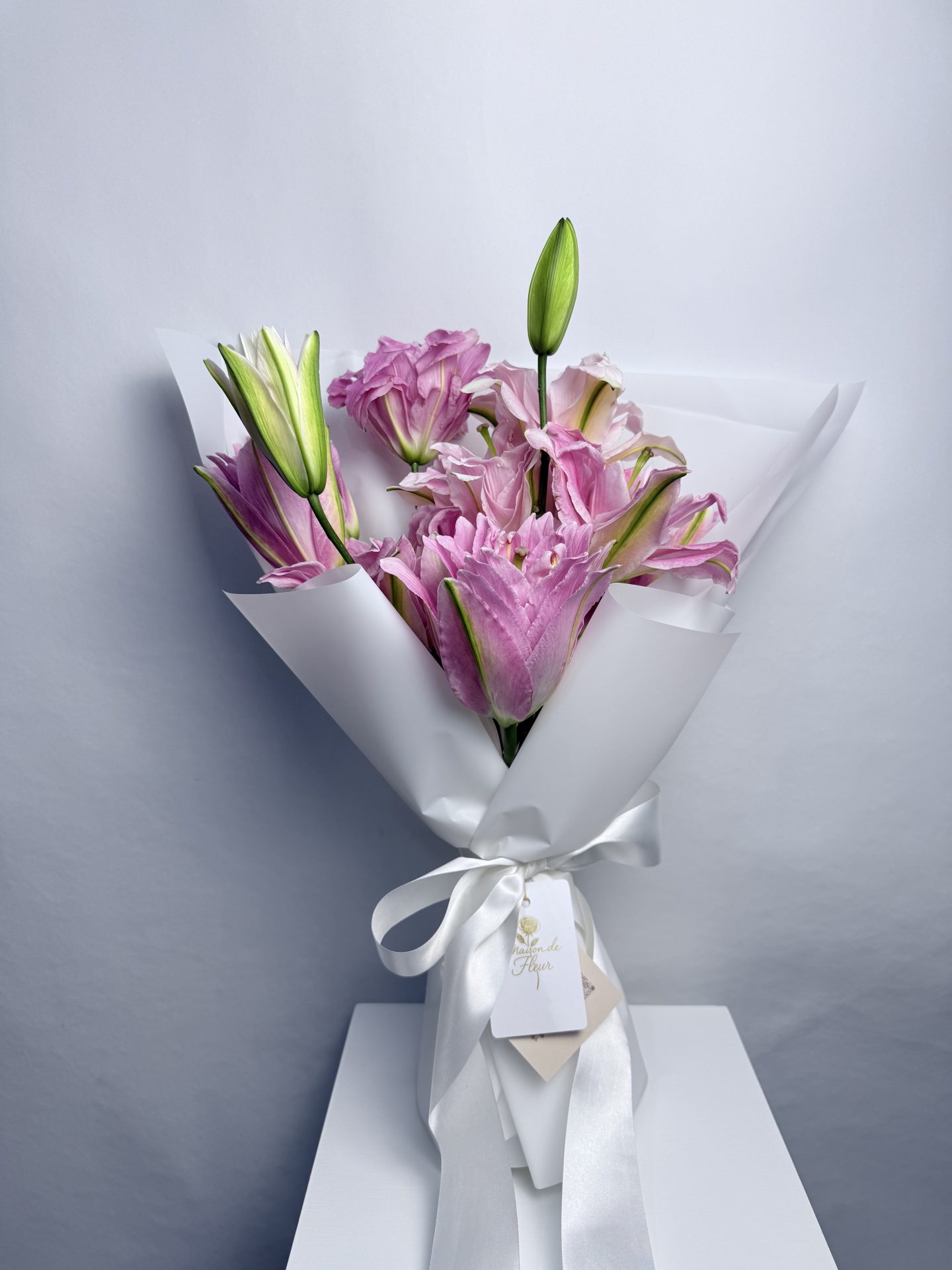 ช่อลิลลี่ชมพูสดคัดพิเศษ จัดเรียงอย่างประณีตในสไตล์มินิมอล ห่อด้วยกระดาษสีขาวและผูกริบบิ้นโทนเดียวกัน โดดเด่นด้วยกลีบดอกที่หรูหราและกลิ่นหอมอ่อนละมุน ให้ความรู้สึกโรแมนติกและสดใส เหมาะสำหรับการแสดงความยินดี การเริ่มต้นใหม่ หรือเพื่อส่งมอบความรู้สึกดี ๆ จากใจ