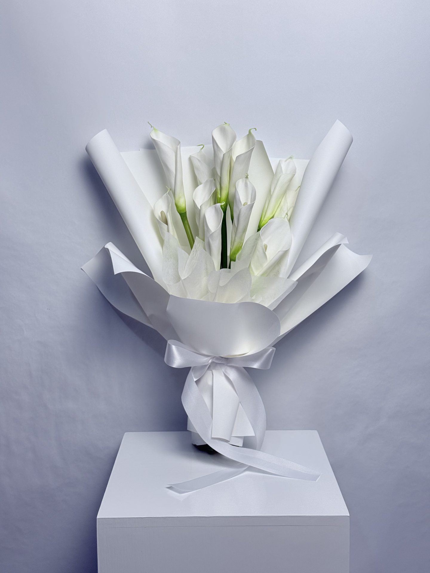 ช่อคาลล่าลิลลี่สีขาวพรีเมียม จัดอย่างเรียบหรูในสไตล์มินิมอล ห่อด้วยกระดาษโทนขาวสะอาด ผูกริบบิ้นสีขาวอ่อนหวาน เหมาะสำหรับงานแต่ง งานรับปริญญา การแสดงความยินดี หรือมอบให้คนพิเศษแทนคำบอกรักที่จริงใจ