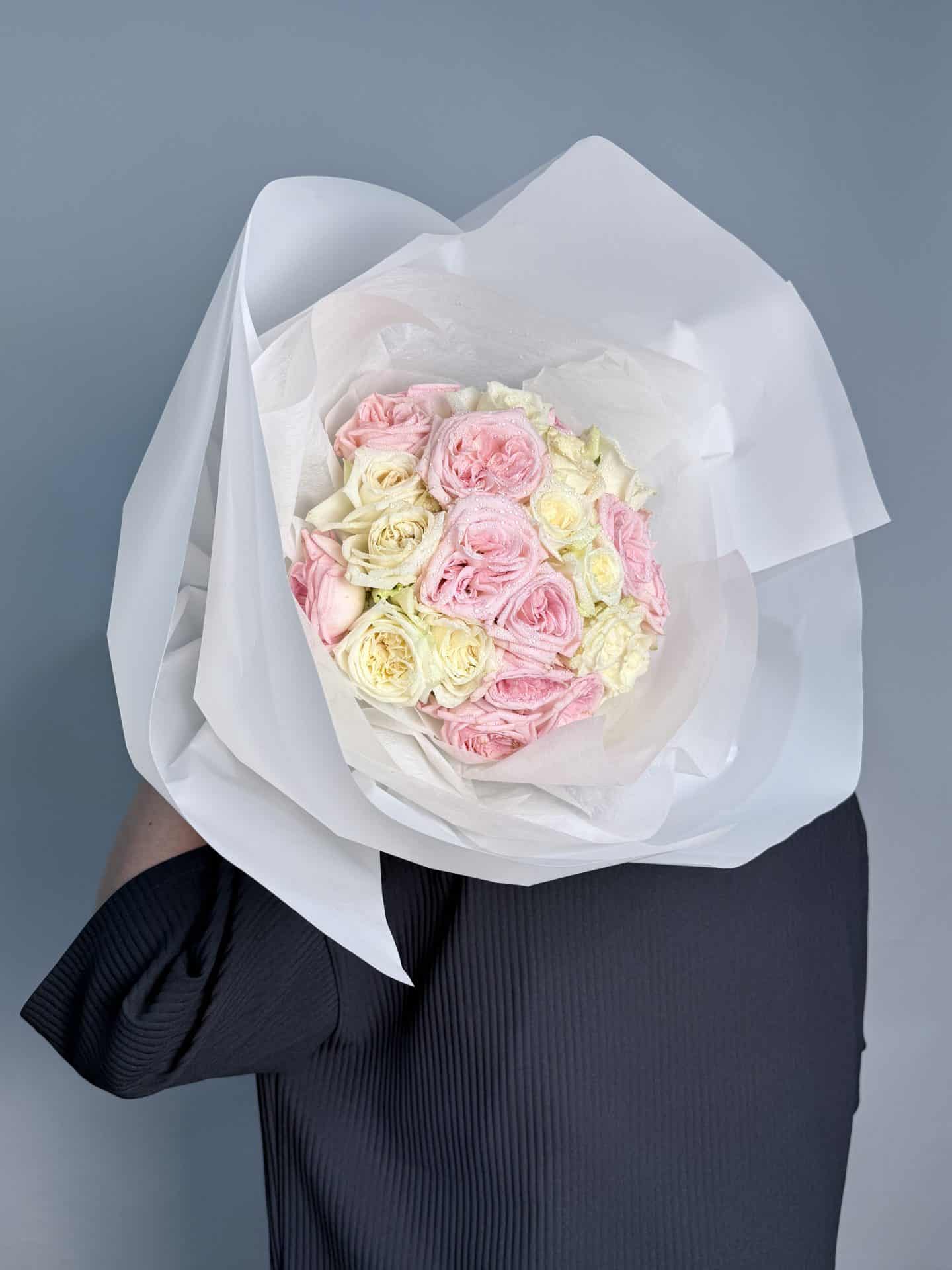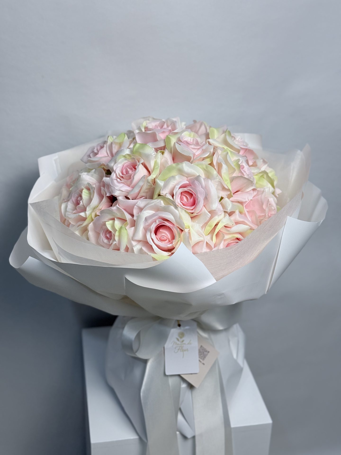 ช่อกุหลาบพาสเทลโทนชมพูอ่อนและขาวครีม คัดดอกพิเศษ จัดอย่างเรียบหรูในสไตล์มินิมอล ห่อด้วยกระดาษสีขาวสะอาดตาและผูกริบบิ้นโทนเดียวกัน สื่อถึงความรัก ความผูกพัน และความปรารถนาดีที่งดงาม เหมาะสำหรับมอบในวันครบรอบ งานแต่งงาน หรือเพื่อบอกความในใจอย่างอ่อนหวาน