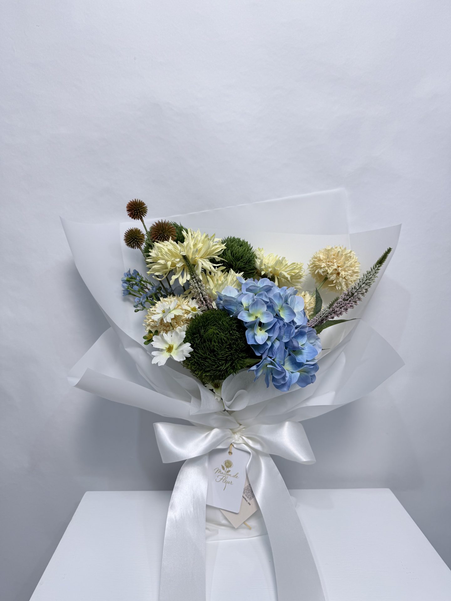 ช่อดอกไม้โทนฟ้า-เหลือง จัดด้วยไฮเดรนเยียสีน้ำทะเลเข้มขัดกับดอกไม้โทนเหลืองอ่อนและขาว เติมความเขียวสดจากใบไม้และมอสธรรมชาติ ห่อด้วยกระดาษสีขาวเรียบหรูและผูกโบว์ซาตินสีขาวอย่างประณีต ให้ความรู้สึกสดชื่น อบอุ่น และทันสมัย เหมาะสำหรับเป็นของขวัญแสดงความยินดี มอบกำลังใจ หรือเพื่อสร้างบรรยากาศสดใสในทุกโอกาส