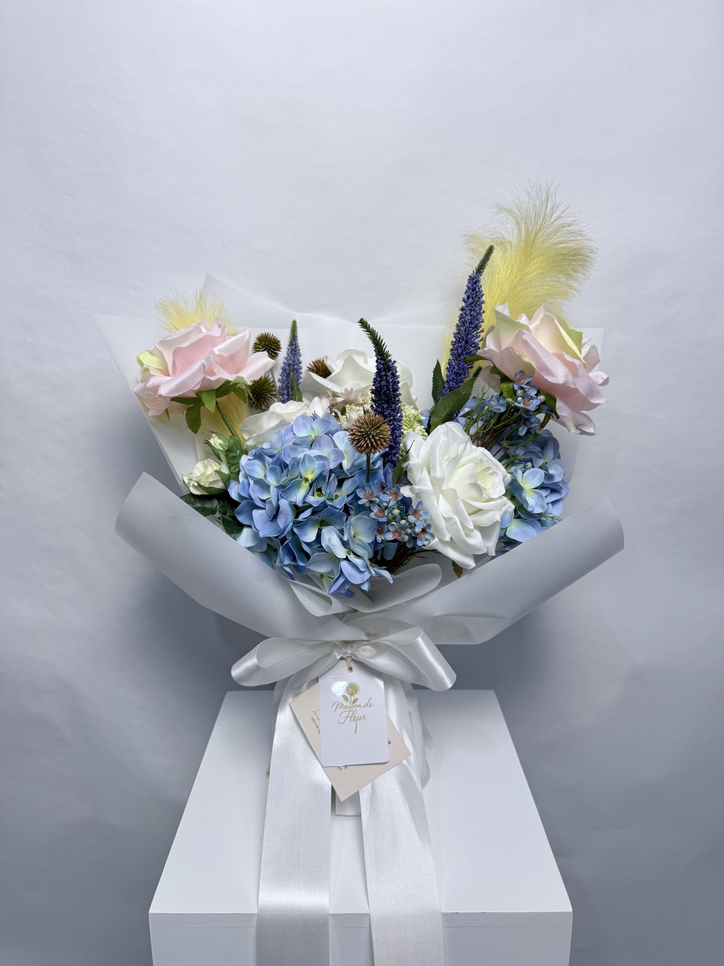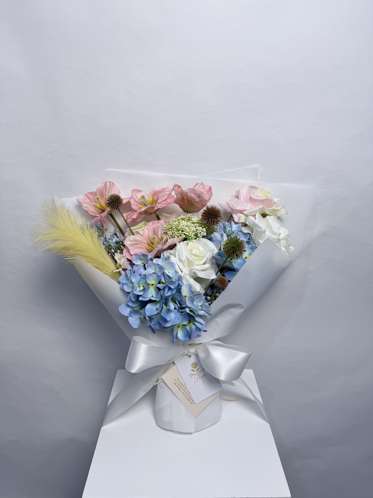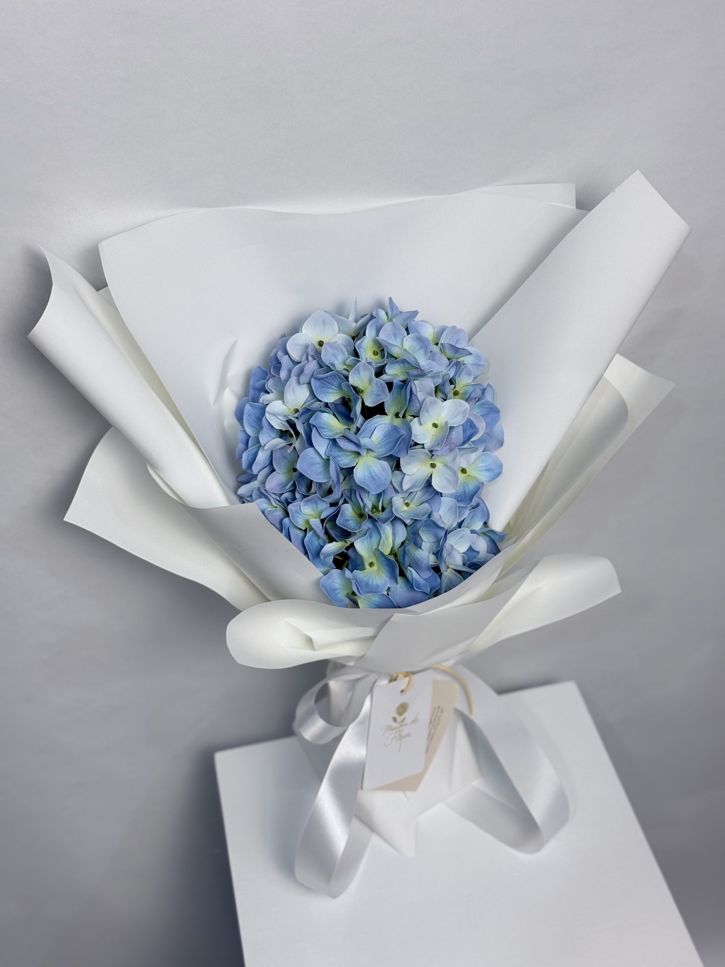 ความงดงามที่คงอยู่เหนือกาลเวลา ถ่ายทอดผ่านไฮเดรนเยียสีฟ้าอ่อนทั้งช่อ ดุจความรักและมิตรภาพที่มั่นคงไม่เปลี่ยนแปลง