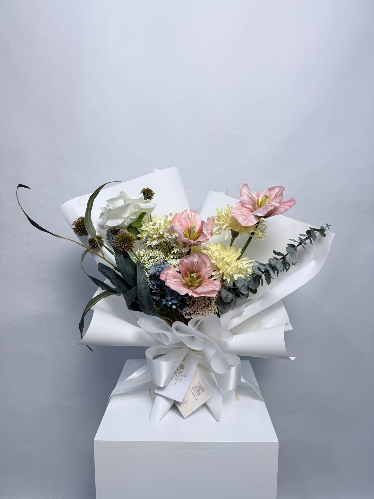 ช่อดอกไม้โทนพาสเทลสดใส จัดผสมด้วยดอกชมพูอ่อน เหลืองครีม และขาว ตกแต่งด้วยใบยูคาลิปตัสและดอกไม้เล็กเพิ่มความมีมิติ ห่อด้วยกระดาษสีขาวหรูหราและผูกโบว์ซาตินขนาดใหญ่ ให้บรรยากาศเรียบหรู อ่อนโยน และอบอุ่น เหมาะสำหรับวันพิเศษ วันเกิด วันครบรอบ หรือเพื่อแสดงความห่วงใยในทุกโอกาส