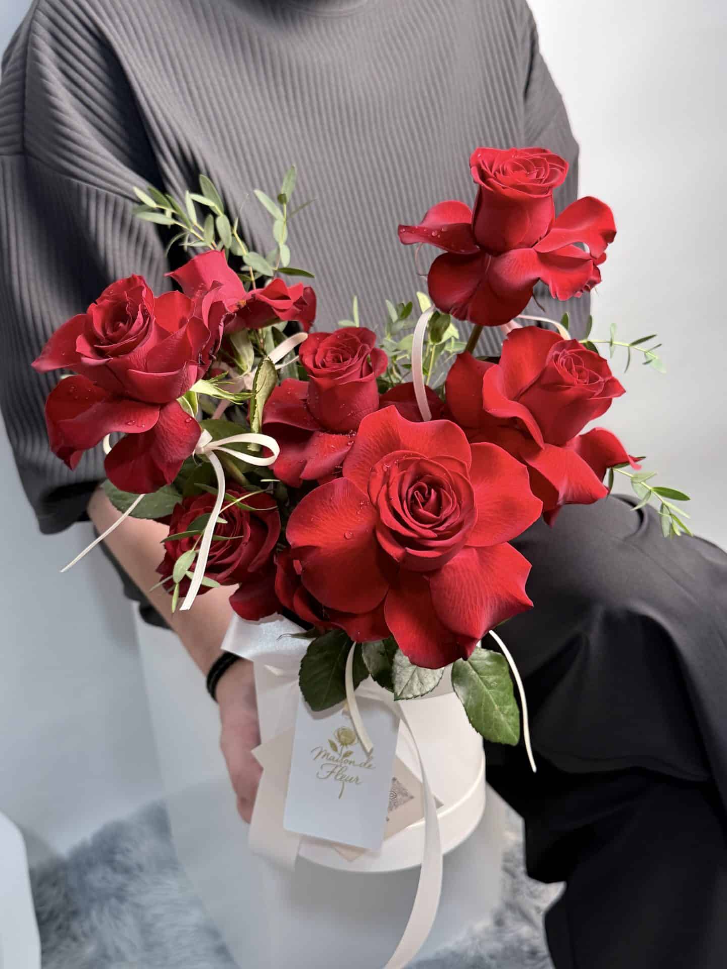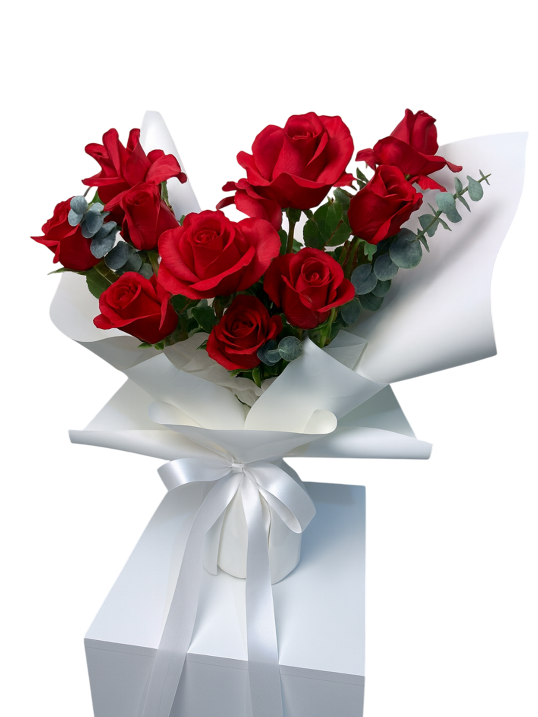 ช่อกุหลาบแดงสดคัดพิเศษ จัดอย่างสง่างามในกล่องทรงหรู ตกแต่งด้วยใบยูคาลิปตัสเขียวขจีและริบบิ้นผูกโบว์สีขาวตัดกับดอกไม้สีแดงเข้ม ช่วยขับความโดดเด่นของช่อให้ยิ่งงดงาม เหมาะสำหรับโอกาสแห่งความรัก การสารภาพใจ หรือเพื่อแสดงออกถึงความรู้สึกที่แรงกล้าและจริงใจ