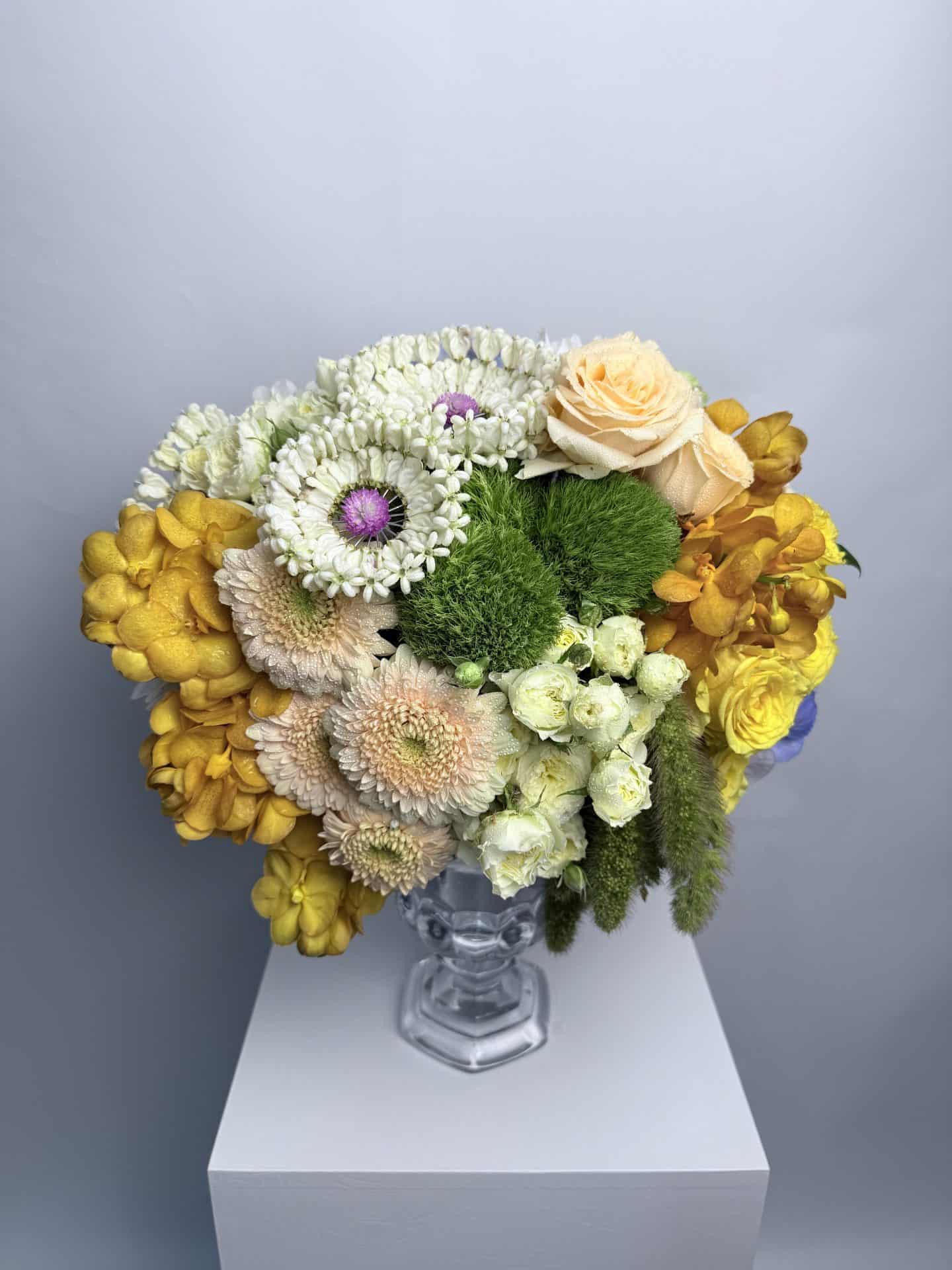 แจกันดอกไม้จัดผสมผสานดอกกุหลาบสีครีม ดอกเดซี่ขาว ดอกเบญจมาศ และดอกไม้โทนเหลือง–พีช เติมความสดชื่นด้วยโทนเขียวธรรมชาติในสไตล์หรูหรา จัดลงในแจกันแก้วดีไซน์พิเศษ ให้บรรยากาศสดใส มีชีวิตชีวา เหมาะสำหรับการส่งความยินดี โอกาสแห่งความสำเร็จ หรือการเพิ่มพลังบวกในทุกพื้นที่