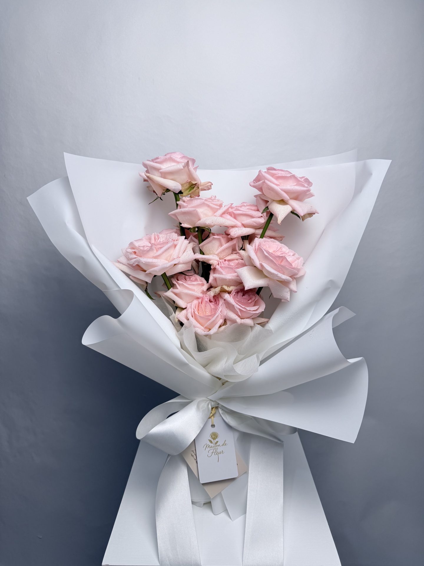 ช่อกุหลาบชมพูอ่อนสดคัดพิเศษ จัดอย่างเรียบหรูในสไตล์มินิมอล ห่อด้วยกระดาษสีขาวบริสุทธิ์และผูกริบบิ้นโทนเดียวกัน ให้ความรู้สึกอบอุ่น อ่อนหวาน และทันสมัย เหมาะสำหรับมอบในโอกาสพิเศษ วันครบรอบ หรือเพื่อบอกความในใจอย่างอ่อนโยน
