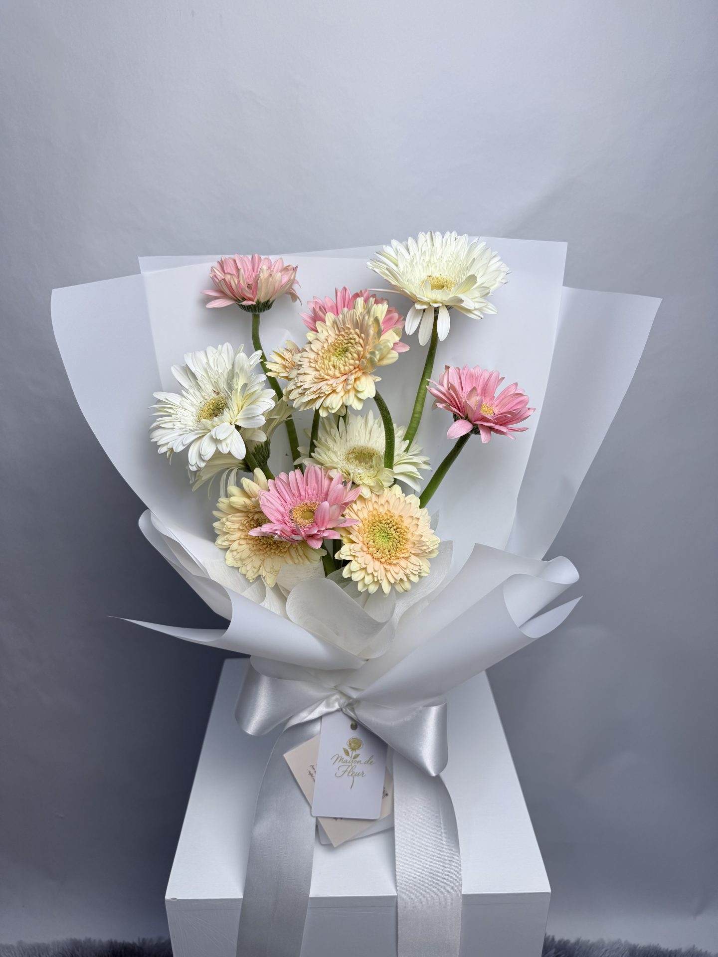 ช่อดอกเยอร์บีราพาสเทลคัดพิเศษในโทนสีชมพูอ่อน ขาว และครีม จัดอย่างเรียบง่ายในสไตล์มินิมอล ห่อด้วยกระดาษสีขาวและผูกริบบิ้นสีอ่อน ให้ความรู้สึกสดชื่น อ่อนหวาน และอบอุ่น เหมาะสำหรับการมอบให้ในโอกาสแห่งความยินดี วันเกิด การแสดงความขอบคุณ หรือเพื่อส่งกำลังใจให้คนสำคัญ