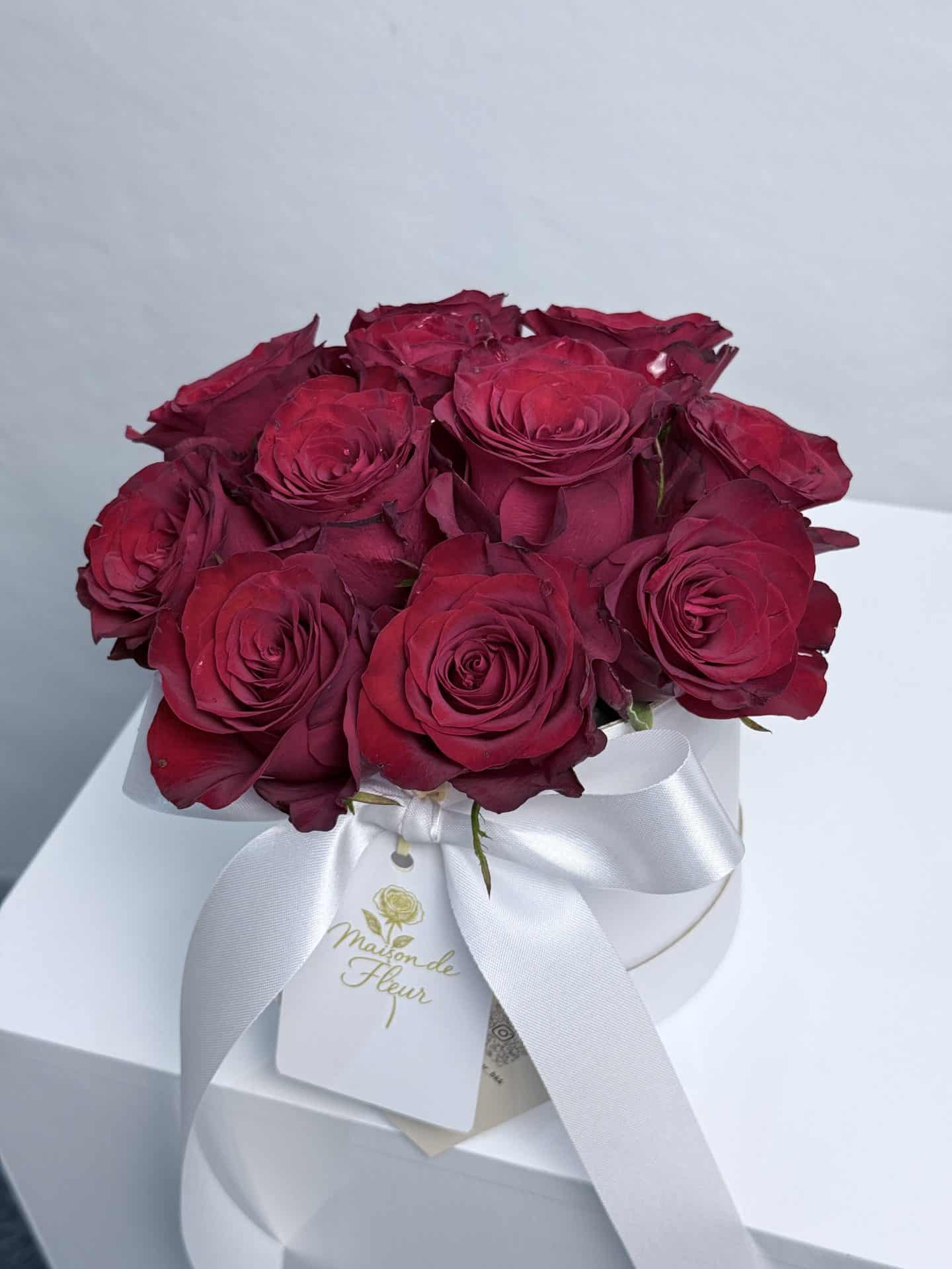 กล่องดอกไม้กุหลาบแดงสดคัดพิเศษ จัดอย่างแน่นเต็มกล่องในสไตล์หรูหรา ผูกริบบิ้นสีขาวตัดกับดอกกุหลาบสีแดงเข้มอย่างสง่างาม เหมาะสำหรับการมอบในโอกาสพิเศษ เช่น วันครบรอบ วันวาเลนไทน์ หรือเพื่อบอกความรู้สึกที่ชัดเจนและมั่นคง