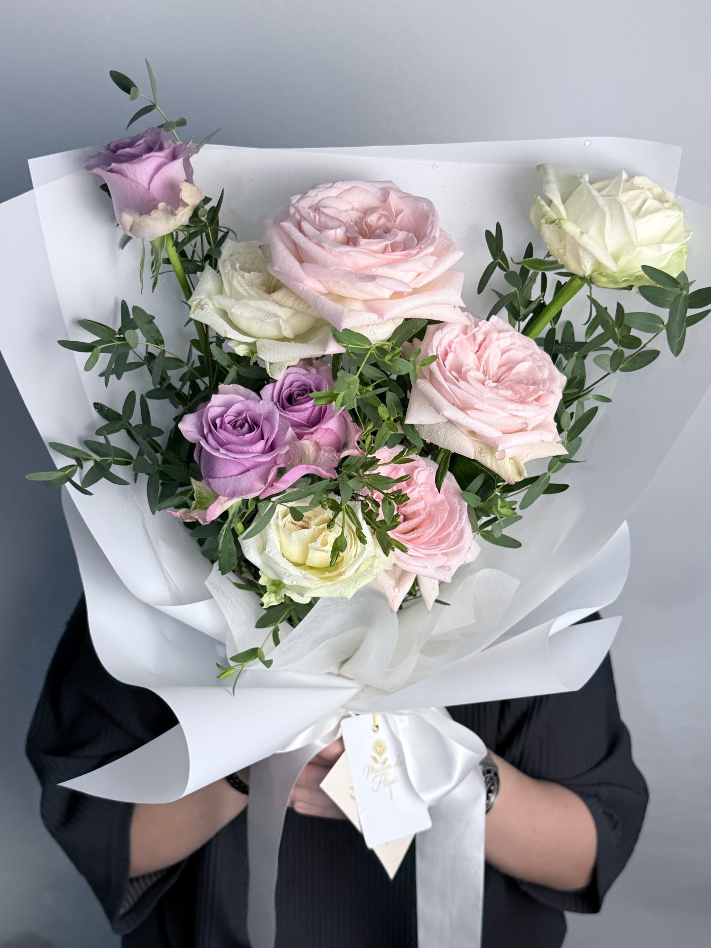 ช่อดอกไม้ที่ผสมผสานกุหลาบโทนสีชมพู ม่วง และดอกไม้แซมสีสันสดใส จัดช่อหรูหราในโทนสีละมุน สื่อความหมายถึงความสุข ความรัก และมิตรภาพ เหมาะกับทุกโอกาสแห่งความยินดี