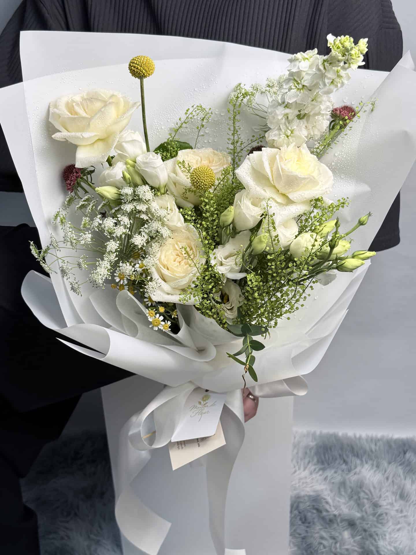 ช่อกุหลาบขาวครีมและลิลลี่คัดพิเศษ ผสมผสานกับดอกไม้แซมสีเขียวอ่อนและเหลืองเล็กน้อย จัดในสไตล์มินิมอลทันสมัย ห่อด้วยกระดาษสีขาวเรียบหรูและผูกริบบิ้นโทนเดียวกัน ให้ความรู้สึกสะอาด สงบ และมีระดับ เหมาะสำหรับการมอบในโอกาสสำคัญ เช่น การแสดงความยินดี การแสดงความห่วงใย หรือการมอบแด่คนรัก