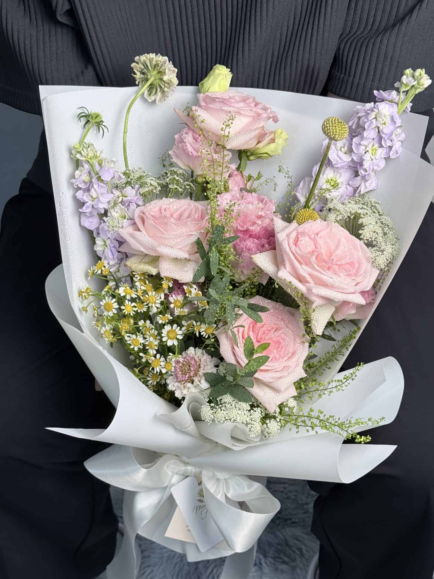 ช่อดอกไม้คัดพิเศษที่รวมกุหลาบสีชมพูอ่อน ดอกเดซี่ และดอกไม้พาสเทลหลากชนิด จัดในสไตล์โรแมนติกมินิมอล ห่อด้วยกระดาษสีขาวและผูกริบบิ้นเรียบหรู ให้ความรู้สึกอ่อนโยน สดชื่น และอบอุ่น เหมาะสำหรับวันเกิด วันครบรอบ หรือเพื่อส่งมอบกำลังใจอย่างจริงใจ