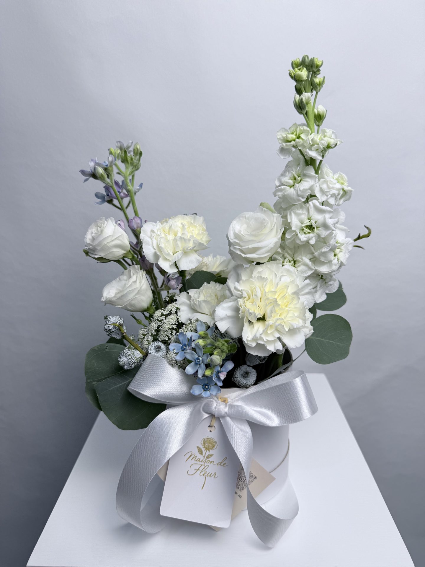 ช่อดอกไม้โทนสีขาวประกอบด้วยคาร์เนชั่น ลิเซียนทัส และดอกไม้แซมสีฟ้าอ่อน จัดลงในแจกันทรงกระบอกสีขาวเรียบหรู ผูกด้วยริบบิ้นสีเงิน เพิ่มเสน่ห์อย่างมีระดับ เหมาะสำหรับการมอบเป็นของขวัญให้ผู้ใหญ่ แสดงความเคารพ หรือใช้ตกแต่งในโอกาสพิเศษที่ต้องการความเรียบง่ายและสง่างาม