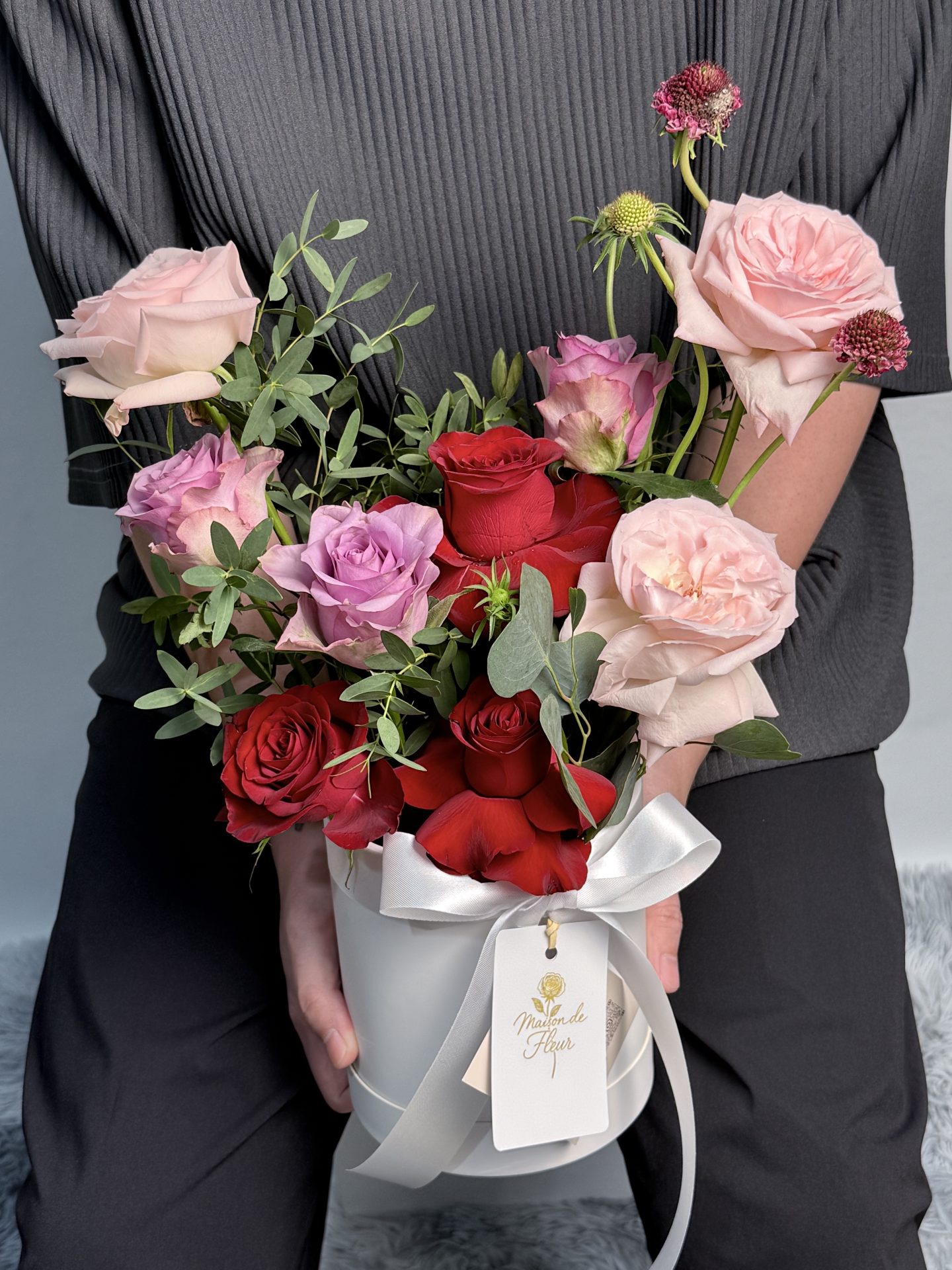 การผสมผสานของกุหลาบหลากสีที่โดดเด่น ทั้งกุหลาบแดงเข้ม กุหลาบชมพูอ่อน และกุหลาบม่วงอ่อน สื่อถึงความงดงามที่มีเสน่ห์หลากหลายมิติ ทั้งความโรแมนติก ความอ่อนโยน และความลึกซึ้ง
