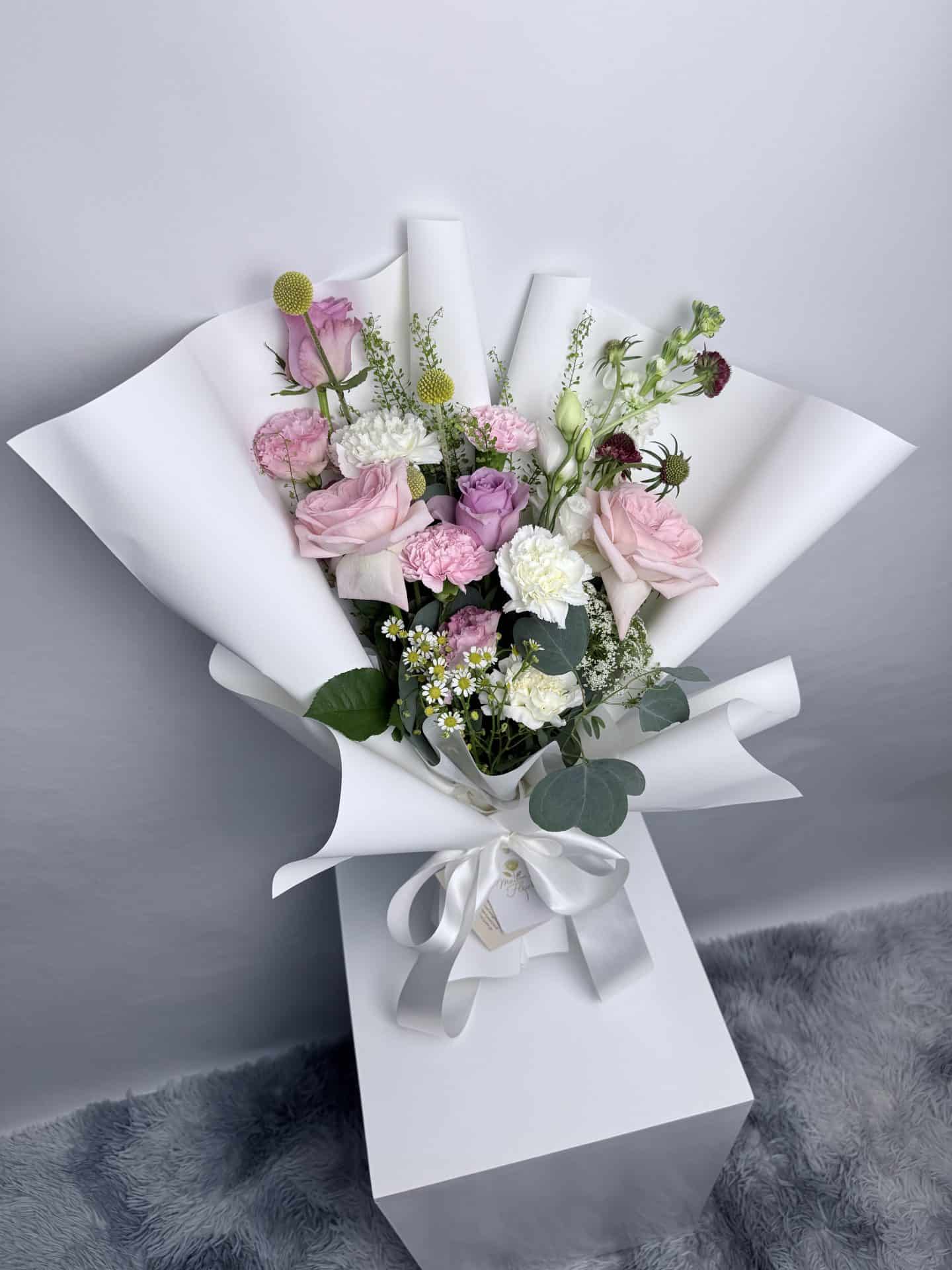 ช่อดอกไม้โทนหวานที่ผสมผสานคาร์เนชั่นสีชมพูอ่อน ลิสซิแอนทัส และดอกไม้แซมสีม่วงพาสเทล แทนความอ่อนโยน สดใส และความห่วงใยอันอบอุ่น