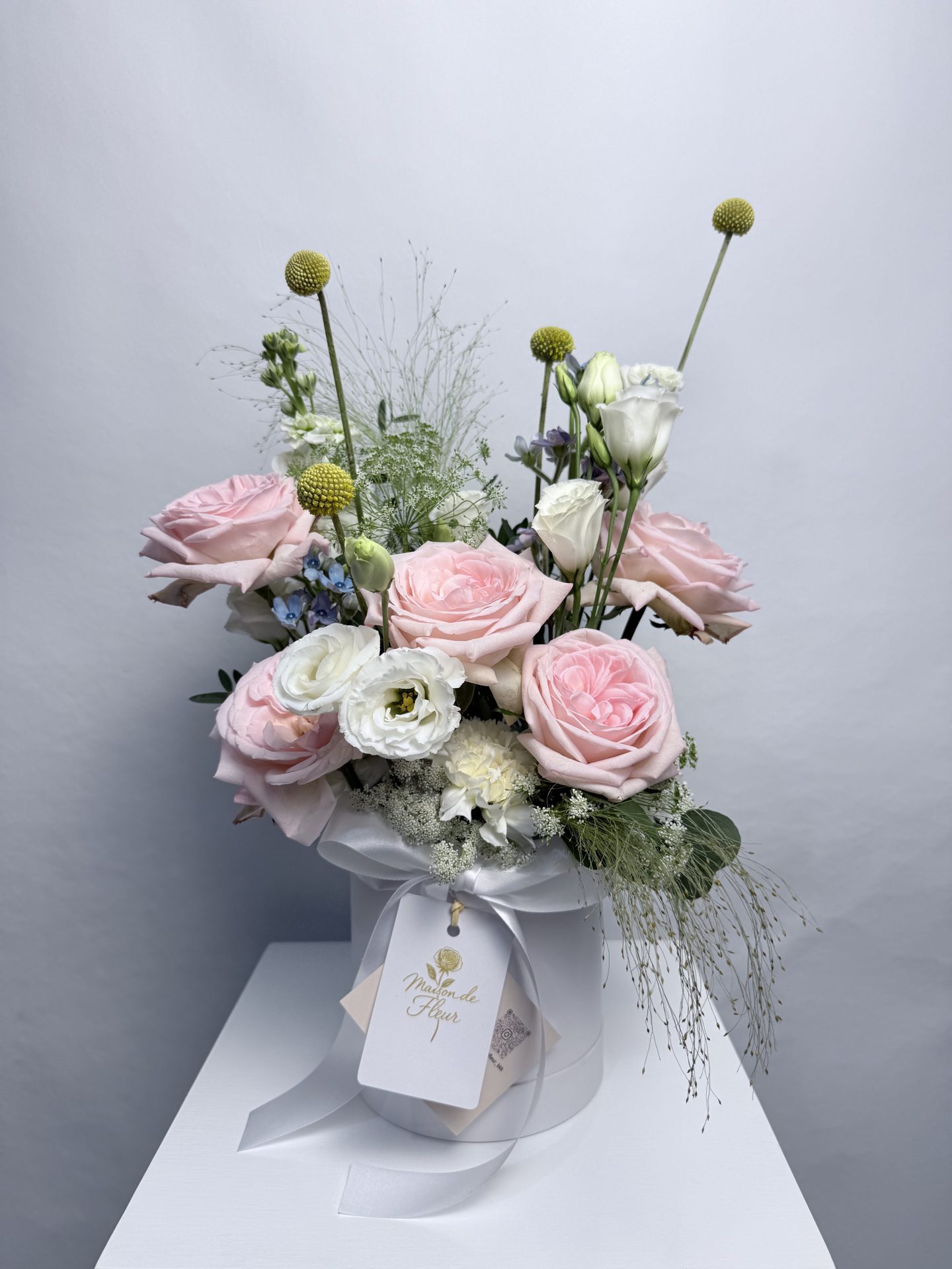 จัดในแจกันทรงกลมขนาดกะทัดรัด ตกแต่งอย่างพิถีพิถันด้วยโทนสีพาสเทล ให้บรรยากาศละมุนและโรแมนติก เหมาะสำหรับมอบในโอกาสแสดงความยินดี ขอบคุณ หรือเพื่อส่งต่อกำลังใจอย่างอบอุ่นและน่ารัก