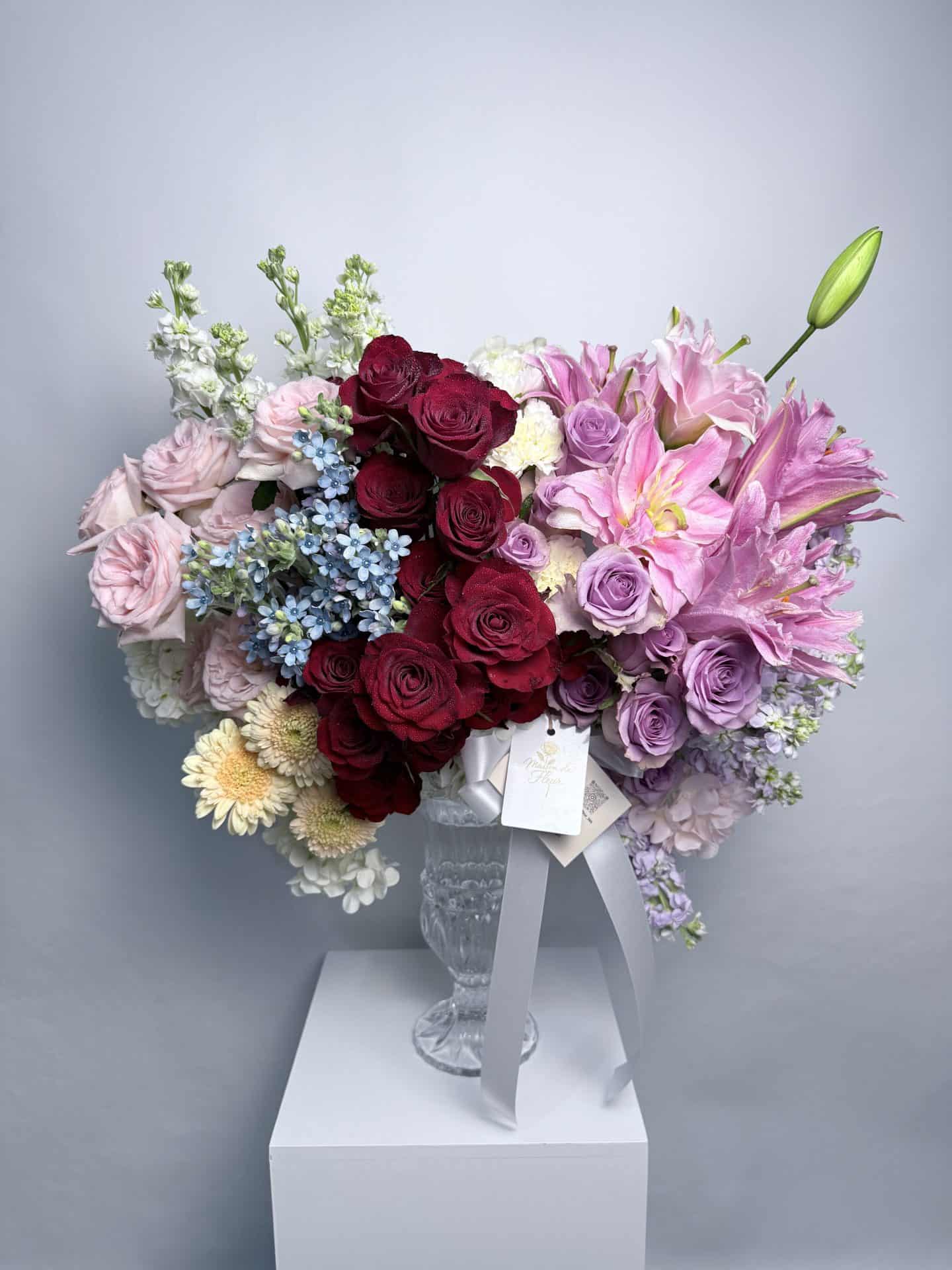 การผสมผสานของกุหลาบสีแดงเข้ม ลิลลี่สีชมพู และดอกไม้โทนพาสเทลที่จัดอย่างวิจิตร สื่อถึงความรักที่ลึกซึ้ง ความงดงามอันอ่อนหวาน และพลังแห่งความสุขที่สดใส